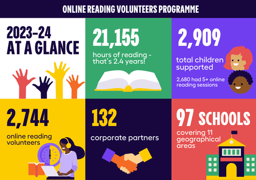 We can provide real-time reporting to our corporate partners on volunteering hours and an end-of-year report on the impact on the reading progress of the children supported by your employees (most will improve by 2-4 levels out of 9). We can also share data from our wider evaluation of the programme across a number of schools and regions. Our teachers report that just 30 minutes reading practice each week makes a huge difference to these children.